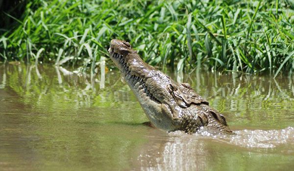 据英国媒体29日报道,近日,在哥斯达黎加旅游的一名业余摄影师用相机捕捉到鳄鱼张开血盆大口,欲袭击另一条船上游客的惊魂一刻。当时一名德国女游客和鳄鱼近在咫尺,险些命丧鳄鱼之口。