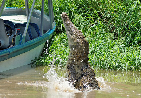 据英国媒体29日报道,近日,在哥斯达黎加旅游的一名业余摄影师用相机捕捉到鳄鱼张开血盆大口,欲袭击另一条船上游客的惊魂一刻。当时一名德国女游客和鳄鱼近在咫尺,险些命丧鳄鱼之口。