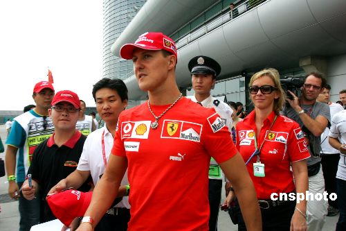 本周中新网热门人物之——舒马赫:7月30日凌晨,法拉利车队正式宣布已经退役的七届世界冠军迈克尔·舒马赫将再度披挂上阵,顶替头部受伤的马萨出战8月23日在西班牙巴伦西亚进行的欧洲大奖赛,直到巴西人伤愈回来。曾7次获得F1大奖赛车手总冠军并被称为世界上速度最快的赛车手舒马赫于2006年底宣布退役。(图片来源:中国新闻网 汤彦俊 摄)