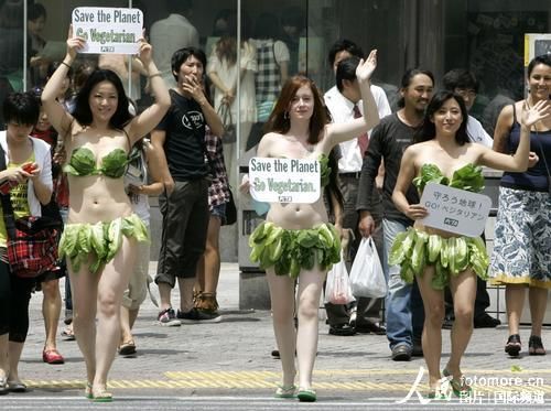 "生菜比基尼"女郎日本街头宣传动物保护