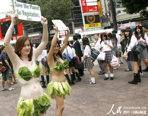 2009年8月3日,日本东京,日本动物保护组织成员在街头举行抗议活动,她们身着由生菜叶子制成的比基尼热辣服装,高举"拯救地球,转到素食”字样的标语在街头宣传。