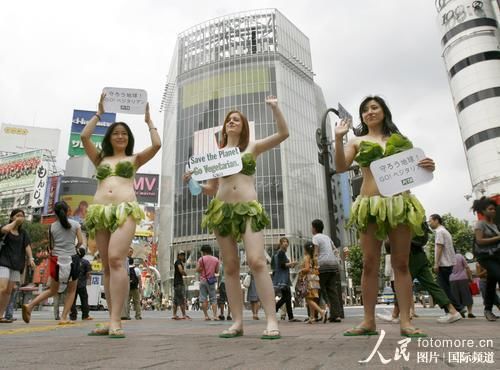 2009年8月3日,日本东京,日本动物保护组织成员在街头举行抗议活动,她们身着由生菜叶子制成的比基尼热辣服装,高举"拯救地球,转到素食”字样的标语在街头宣传。
