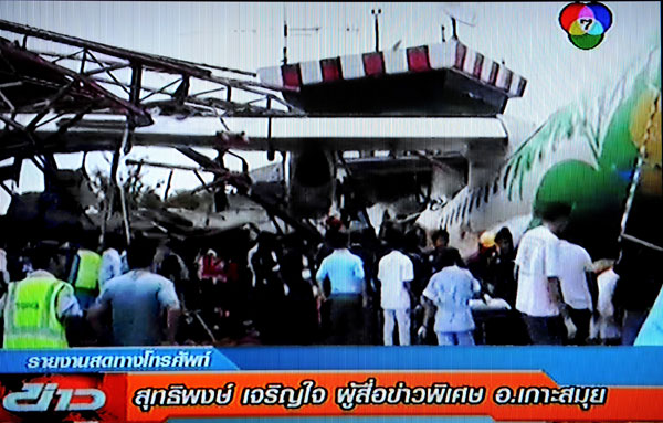 8月4日,曼谷航空公司一架客机在泰国南部苏梅岛机场着陆时冲出跑道,并与一座航空控制塔相撞。飞机上载有68名乘客和4名机组人员。据法新社报道称,目前已造成一名飞行员死亡,10名乘客受伤。图为泰国一家电视台播放的画面截图。