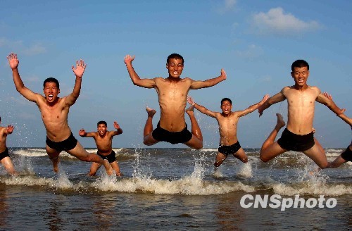 七月中旬,享有“铁军”美誉的济南军区某红军师近万官兵不远千里来到黄海之滨,进行首次海上适应性训练,他们要用汗水和意志去约会大海。在近一个月与海水的亲密接触中,这些多数是头一回见到海的士兵将要与浪共舞,完成岸滩训练、近海游泳、海上救生、武装泅渡等多个课目的海上适应性训练。 目前,铁军海训部队已经完成岸滩训练、近海游泳等科目的训练任务。接下来,这群刚刚学会游泳的士兵,还要重新穿上迷彩全副武装地在海上进行海上救护、武装泅渡等科目的训练。 中新社发 曾宪平 摄