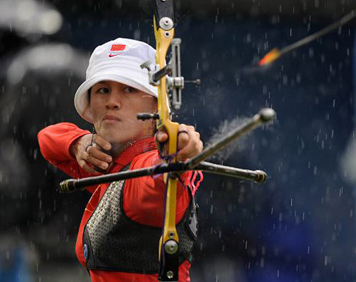 图为在北京奥运会上中国运动员张娟娟雨中夺冠。