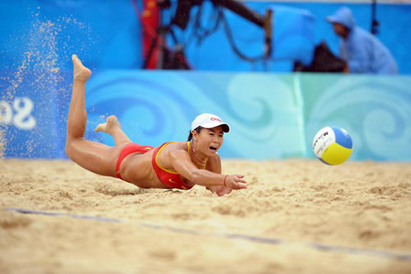 图为在北京奥运会的女子沙排比赛中,中国运动员飞身救球。