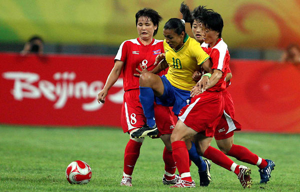 图为在北京奥运会上,世界足球小姐巴西队的玛塔在比赛中挣脱防守。