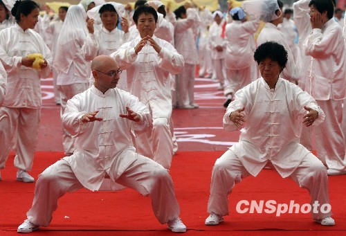 8月8日,中国首个“全民健身日”,来自西班牙的卡洛斯有幸参加北京万人太极拳表演,并与北京友人切磋技艺。为纪念北京成功举办奥运会、残奥会一周年,北京市万人太极拳表演在奥林匹克公园庆典广场及景观大道举办,并以33996人同舞太极而成功创造了新的吉尼斯世界纪录。中新社发 张宇 摄