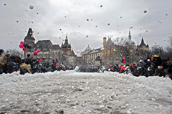 打雪仗世界纪录:匈牙利一家公司组织人们在首都布达佩斯的一个公园内集体打雪仗,他们希望打破美国密歇根理工大学在2006年创下的3700多名学生集体打雪仗的吉尼斯世界纪录。