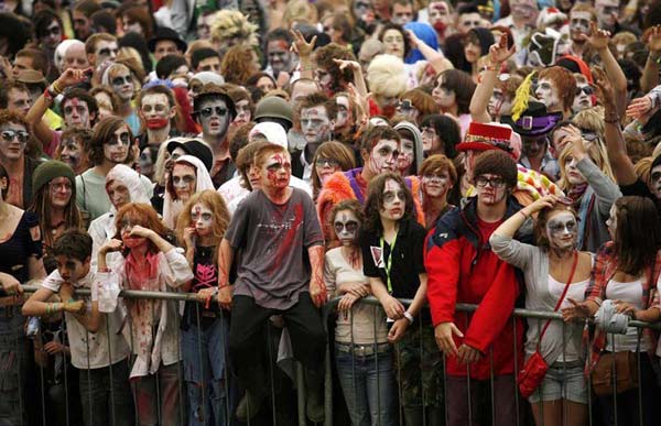 民众扮演僵尸破世界纪录:4026名满身鲜血,死状恐怖的“僵尸”群集英国赫尔福德郡莱德伯里市,刷新最大规模“僵尸集会”的世界记录。(图片来源:CFP)