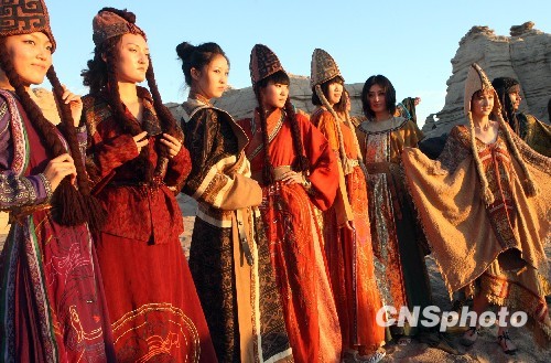 日前,在新疆著名的名胜古迹雅丹地貌(魔鬼城),国际旅游小姐中国新疆赛区总决赛的佳丽身穿晚装和别具特色的古西域民族服饰展示风采。中新社发 钱兴强 摄