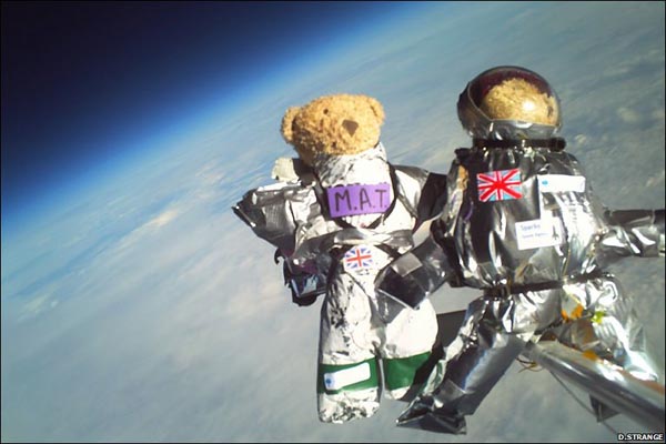 2008年12月1日,四个泰迪熊被氦气球带着上升到了30085米的高空,剑桥大学的这项研究旨在探索绝缘材料。