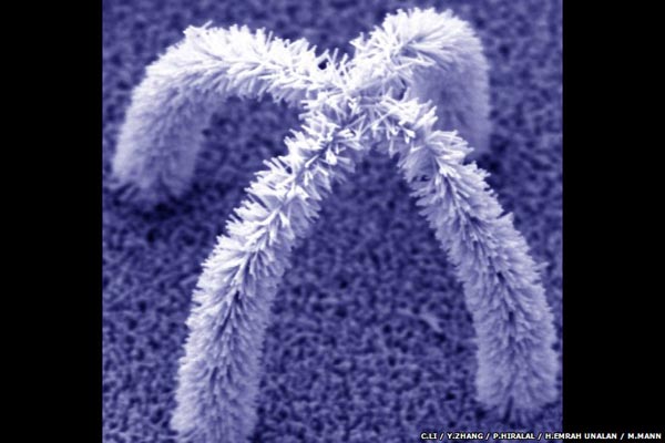 这个迷你的结构由纳米管和氧化锌构成,电子显微镜拍下了这个精巧的结构。