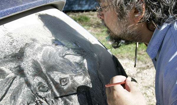 据英国媒体12日报道,来自美国一位德克萨斯的艺术家,经常利用汽车车窗上的灰尘作画。这些用尘垢创作的艺术品,让他的车成为真正的街头艺术。不过,他的作品也经常因为天气的变化而遭到破坏。