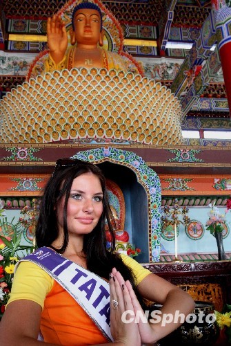 图为各国佳丽在南海禅寺拜佛。中新社发 钱兴强 摄
