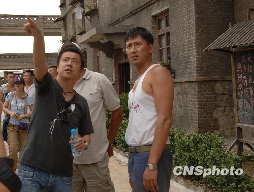 8月21日,冯氏新片《唐山大地震》首次开放在唐山外景地的媒体探班。耗资千万的场景按照历史照片打造,真实再现了70年代街景,而这些场景在仅仅拍摄4天后就将被推掉。群众演员也将达5万-8万人次。导演冯小刚、主演徐帆、张国强出现在片场。图为华谊老总王中磊和主演张国强说戏。中新社发 李学仕 摄