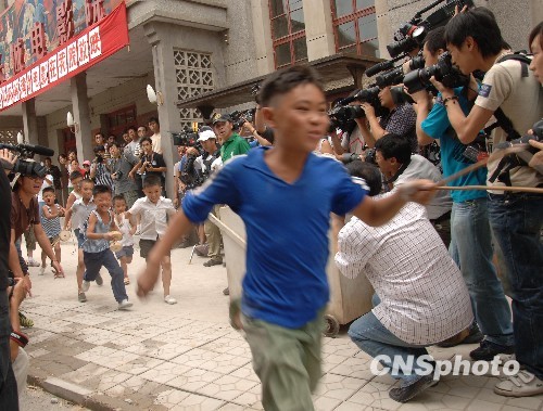 8月21日,冯氏新片《唐山大地震》首次开放在唐山外景地的媒体探班。耗资千万的场景按照历史照片打造,真实再现了70年代街景,而这些场景在仅仅拍摄4天后就将被推掉。群众演员也将达5万-8万人次。导演冯小刚、主演徐帆、张国强出现在片场。图为冯小刚在执导一场儿童追逐打闹的戏份。中新社发 李学仕 摄