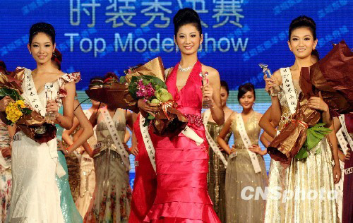 9月28日晚,第59届世界小姐中国区总决赛时装秀在深圳东部华侨城上演。选自中国各地的60名佳丽盛装华丽亮相。图为来自深圳的佳丽张恩获得时装秀冠军(中)、来自上海的沈静雯(左)获得亚军、来自天津的李萌获得季军。中新社发 钱兴强 摄