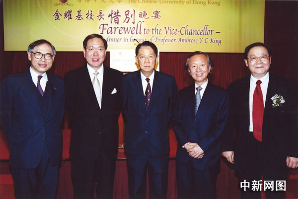 香港中文大学几位历任校长在一起。左起:刘遵义教授(现任校长)、李国章教授、马临教授、高锟教授,以及金耀基教授。