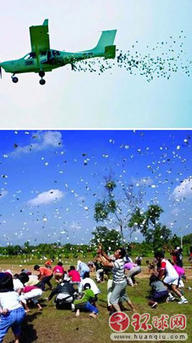 天上掉馅饼”的事可能不会发生,但“天上掉钱”的事2008年6月却在印度尼西亚真实地上演了。印尼一名书商董德森哇林印为了推销自己的新书,组织了一场从飞机上撒钱的宣传活动。这名书商乘坐小型飞机,在印尼首都雅加达以西60公里处西冷市一座足球场的上空来回盘旋,前后撒下了1亿卢比(印尼货币,又称盾,约合1.1万美元)的钞票。这个疯狂的撒钱行动很早便开始在坊间流传,闻风而至的民众当日一早便来到足球场,等着飞机划过天际,满心期待钞票从天而降。
