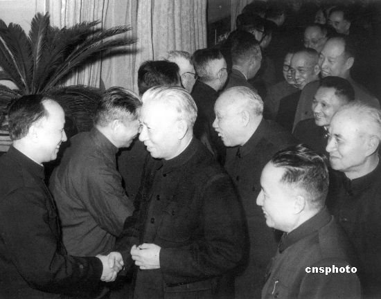 刘少奇、董必武、邓小平、彭真、李富春、谭震林在李四光、范长江陪同下接见钱学森等著名科学家。