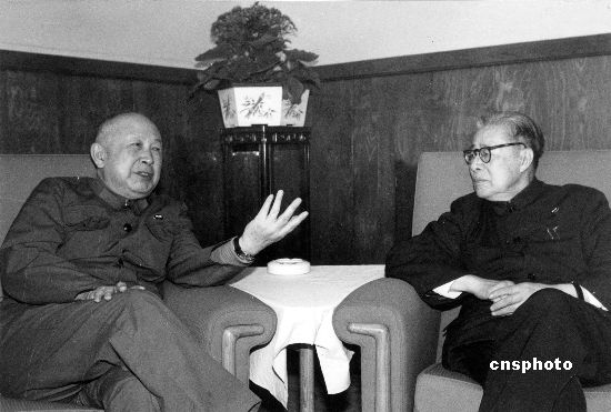 著名科学家钱学森(左)和南开大学校长杨石先先生交谈。