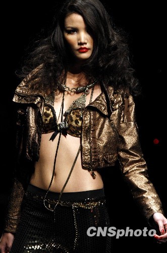 11月3日晚,在北京举行的中国国际时装周2010春夏系列发布上,李志龙DGVI 2010春夏系列闪亮登场,作品以Gossip Girl为主题,运用色彩的跨度,从浅金色到荧光粉红,所有款式仿佛顿时有了娇嗔的呼吸。从光怪陆离的夜色中收集灵感,绝不跟风,绝不媚俗,西西里岛文化的滋养,让DGVI好似一曲华美而炫动的电子音乐。新鲜的New Age之风。图为模特展示李志龙DGVI 2010春夏系列作品。中新社发 钱兴强 摄