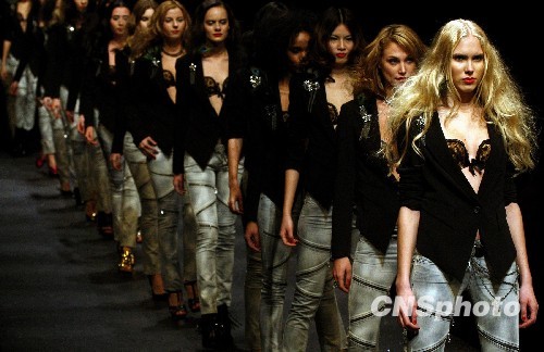 11月3日晚,在北京举行的中国国际时装周2010春夏系列发布上,李志龙DGVI 2010春夏系列闪亮登场,作品以Gossip Girl为主题,运用色彩的跨度,从浅金色到荧光粉红,所有款式仿佛顿时有了娇嗔的呼吸。从光怪陆离的夜色中收集灵感,绝不跟风,绝不媚俗,西西里岛文化的滋养,让DGVI好似一曲华美而炫动的电子音乐。新鲜的New Age之风。图为模特展示李志龙DGVI 2010春夏系列作品。中新社发 钱兴强 摄
