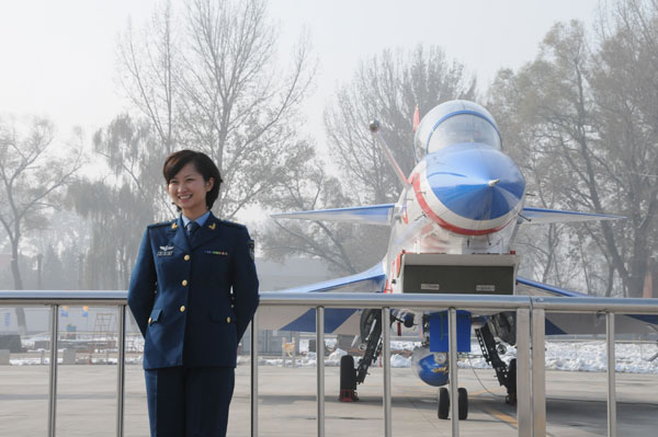 美丽女兵在歼10双座型表演机前留影。杨雷摄