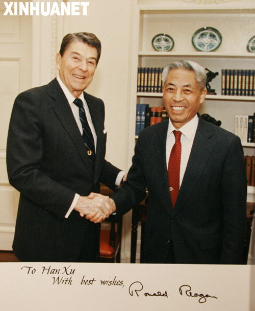 1988年12月14日在中美建交十周年前夕,里根总统在白宫会见中国驻美大使韩叙。里根总统在照片上题字:“向韩叙致以诚挚祝福。罗纳德·里根。”图片来源:新华网