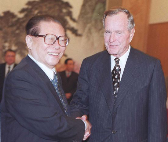 老布什与中国的渊源始于1974年,他在北京美国驻中国联络处待了13个月,就回国出任中央情报局局长去了。图为2000年3月2日,中国国家主席江泽民在北京会见美国前总统布什及夫人一行。满会乔 摄