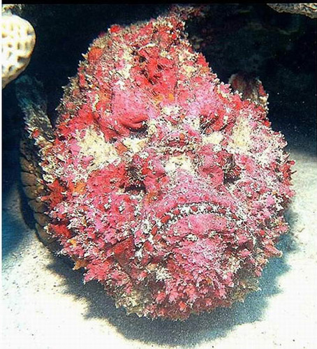 石头鱼是伪装高手,它沉到海底,跟一块石头没有什么两样。此外,石头鱼还是世界上最毒的鱼之一,它的硬棘锐利且带有剧毒,它并不主动进攻,经常以守株待兔的方式等待食物的到来,千万不要因为好奇而去招惹它。