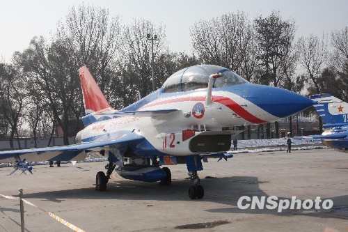 11月13日,北京沙河机场,中国自主研发的、参加国庆60周年首都阅兵的空警-2000型预警机、空警-200型预警机、轰油-6型加油机、轰-6H型轰炸机、歼-11、歼轰-7、教-8、红箭-12、红箭-9地空导弹武器系统发射车等空军主战装备一一排列,展示着中国人民空军发展壮大历史和战斗力发展新水平。图为歼-10双座表演机。中新社发 国刚 摄