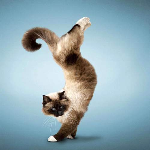 混合技术:鲍里斯的妻子曾是一名瑜伽老师,她从朋友和家人们那里借到这些猫当模特,耐心地哄它们摆出各种姿势。
