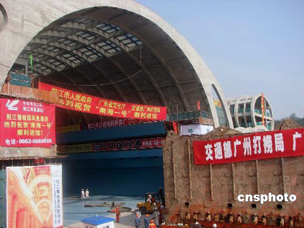 2007年12月28日下午三时四十五分,“南海一号”南宋古沉船成功入住广东海上丝绸之路博物馆“水晶宫”。当日下午二时三十分,现场开始作业,十分钟之后,南海一号的“第一只脚”迈入水晶宫门口。三点十分左右,即将达到指定位置三米时,打捞沉井向左偏离,作业人员通过调整气囊位置和气压进行纠正。三点三十二分,沉井完全进入水晶宫。三点四十五分,南海一号到达宫内指定位置。中新社发 索有为 摄