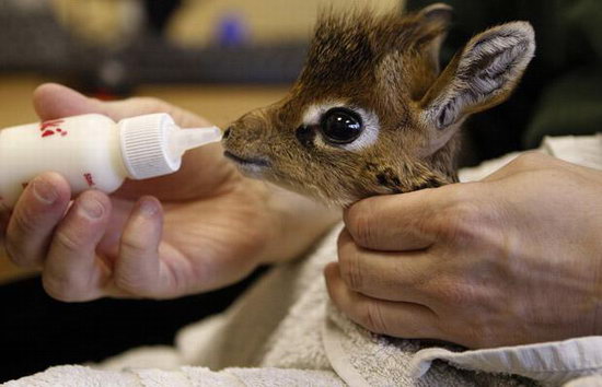 在英国切斯特动物园内,工作人员亲手为一只小跳羚喂奶。