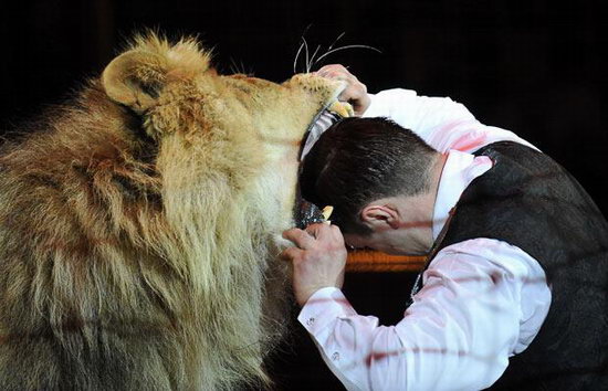 布达佩斯特国际马戏艺术节即将开幕,在排练时,一名乌克兰训狮员将头塞入狮子口中。