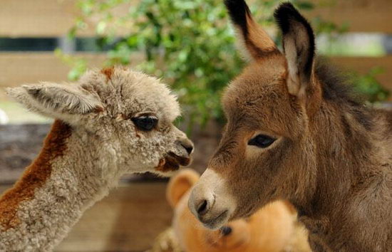 图为小驴崽Sparky就和小羊驼交上了朋友。