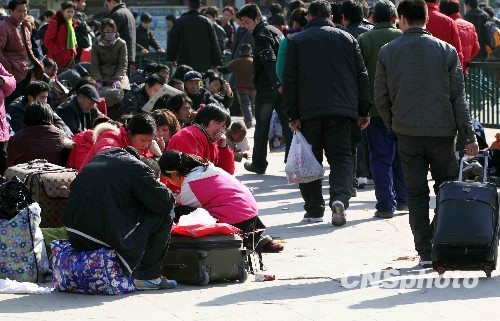 随着春节假期临近结束,江苏徐州火车站、汽车站返程的旅客越来越多。2010年2月19日,大年初六,刚过完春节的打工族、走亲访友的市民便忙着返城务工、上班,使得火车站、汽车站迎来新一轮春运客流高峰。前往成都、西安、广州、深圳、新疆等超长线路的客票较为紧俏。中新社发 雍君 摄