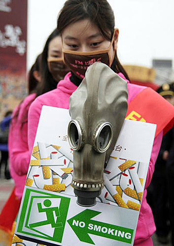 3月1日,杭州一家电台的女主播控烟宣传员手拿防毒面具和宣传板宣传控烟。图片来源:新华网 鞠焕宗 摄