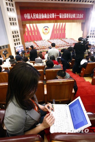 全国政协十一届三次会议3月3日下午在北京人民大会堂隆重开幕,记者现场使用3G网卡发稿,争分夺秒。中新社发 杜洋 摄