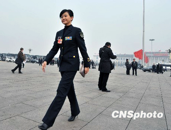 3月3日下午,政协委员宋祖英走向北京人民大会堂,出席全国政协十一届三次会议开幕式。中新社发 贾国荣 摄