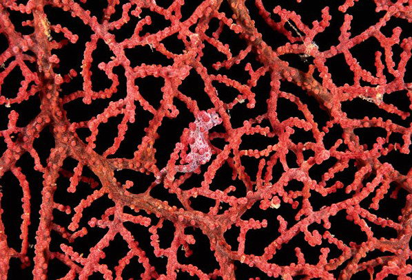 豆丁海马:图中豆丁海马躲在红珊瑚之中,它红色的身体与弯曲的形态,与珊瑚相匹配,让人难以辨认。