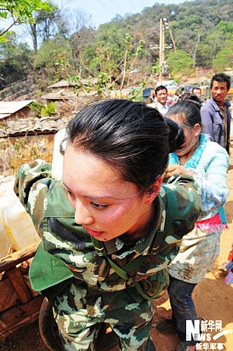 村里有劳动力的农户可以到水车边来装水,还有一些孤寡老人和残疾人,需要这些女兵用肩扛手提的方式送水入户。本文图片由刘昕、杨雷、吴邦纯、贾松基拍摄