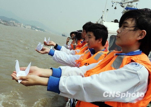 4月1日,清明节临近,曾参加过中国第四批海地维和防暴队的福州马尾边防大队王水华、康成武等4名边防警官与马尾边防大队官兵以及驻地闽安中学的师生们,乘坐边防船艇来到闽江口,以“低碳环保、绿色文明”的海祭方式,为8位维和英烈举行海祭仪式,共同缅怀维和英烈。图为参加该海祭仪式的闽安中学学生通过放飞纸鹤的方式哀悼维和英烈。2009年1月13日,正在海地执行联合国维和任务的8名中国维和警察在海地强烈地震中遇难。中新社发 刘可耕 摄