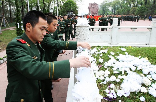 4月2日,中国传统清明节前夕,重庆公安消防总队官兵到重庆市歌乐山烈士陵园祭扫先烈,并宣读该总队首创的《重庆消防员誓词》。图为消防官兵在烈士墓旁放下自己折的小白花。中新社发 郭晋嘉 摄