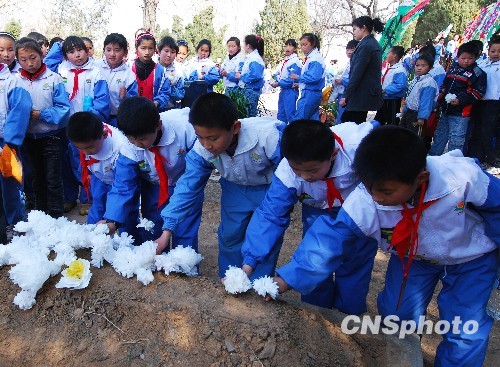 4月2日,山东邹平县中小学生以及各界群众3万余人到革命烈士陵园进行祭扫活动,为革命烈士敬献花圈,缅怀先烈丰功伟绩,寄托无限哀思。中新社发 董乃德 摄