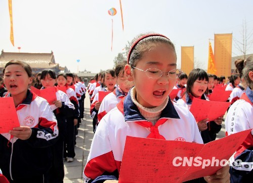 4月2日,老子故里河南省鹿邑县一千名中小学生代表齐聚老子讲学地明道宫,诵读《道德经》,缅怀先哲老子。清明节前夕,鹿邑县倡导文明祭扫方式,纪念先哲老子。中新社发 闫广君 摄