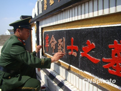 清明前夕,武警台州边防支队官兵来到浙江台州“解放一江山岛”革命烈士陵园,给烈士墓重新油漆、装饰,用这种方式缅怀先烈,寄托哀思。中新社发 周炜 摄