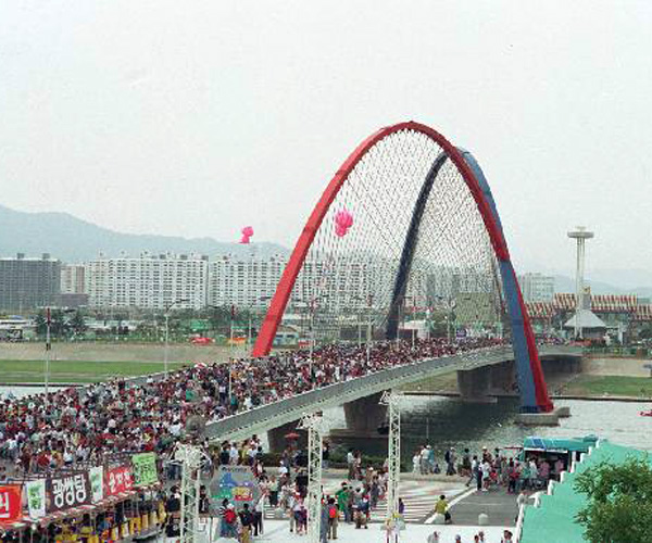 这是人们通过世界博览会大桥,前来参观1993年韩国大田世界博览会。为期93天的大田世界博览会于1993年8月7日至11月7日举行,包括中国在内的108个国家和33个国际组织参加了这次盛会。博览会以“新的起飞之路”为主题,荟萃了世界最新科技成果和各国传统技术精华,并谋求解决经济发展中的南北贫富分化问题、环境问题和能源问题等,探索人类文明发展走向。